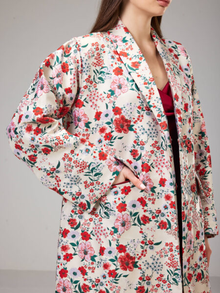 Red Floral Jacket Abaya is cut from jacquard fabric in a straight silhouette with embroidered pockets