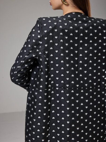 Jacket-cut abaya crafted from textured jacquard fabric with an elegant heart print, featuring a defined waist and full-length sleeves.