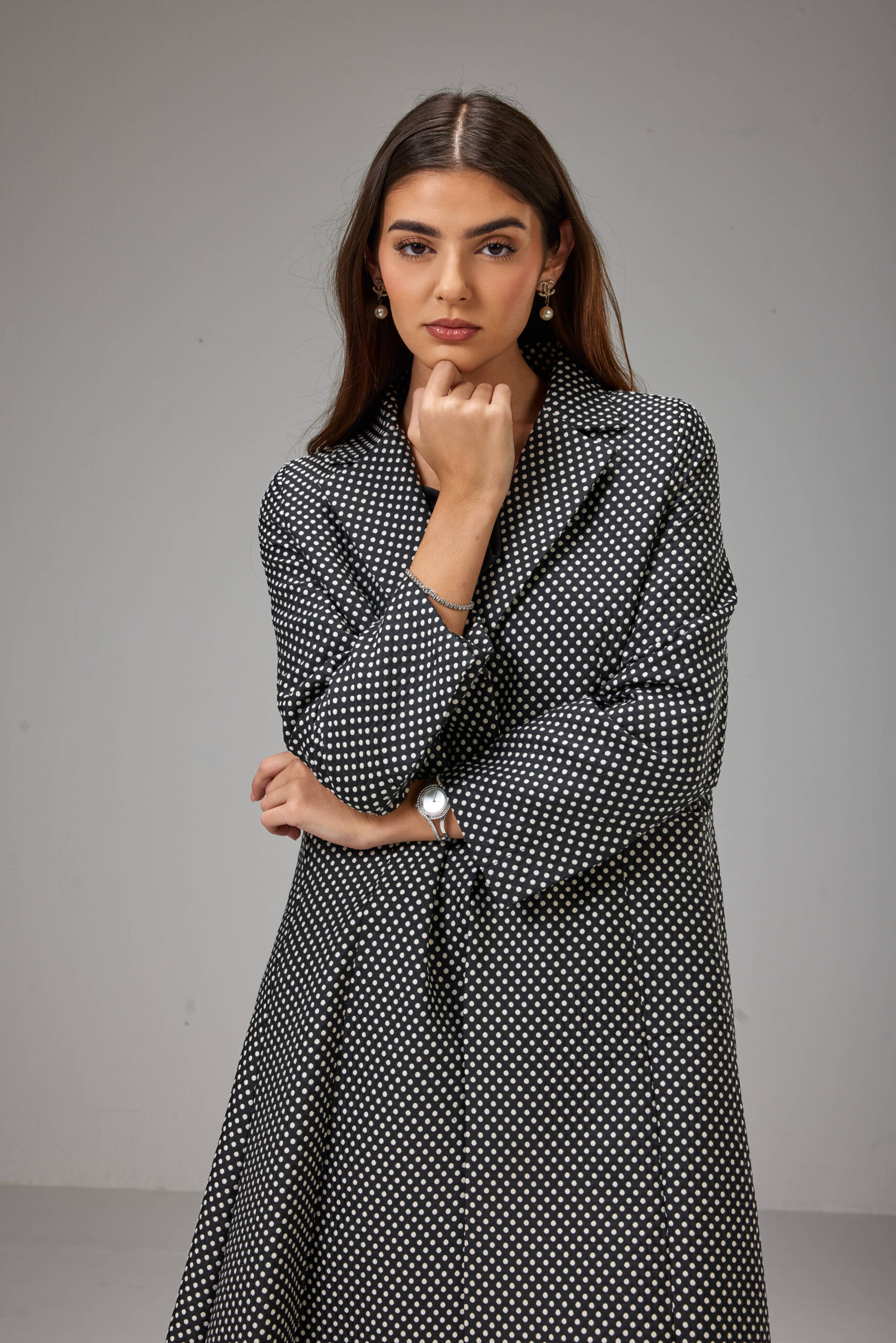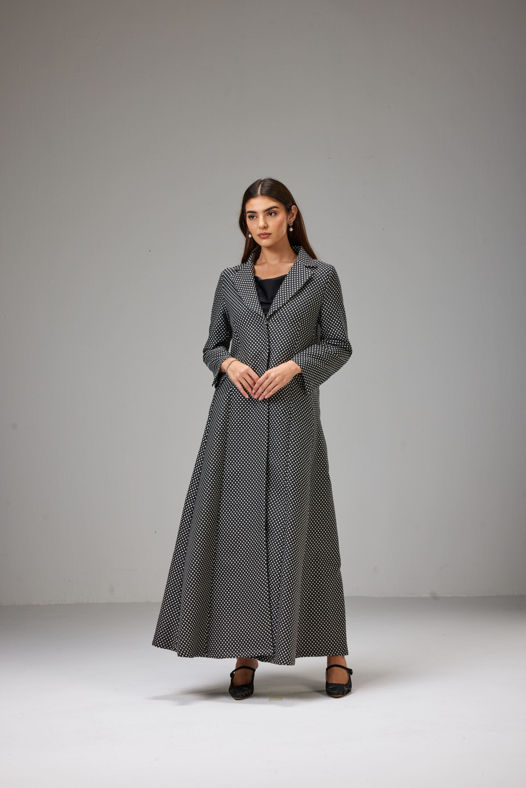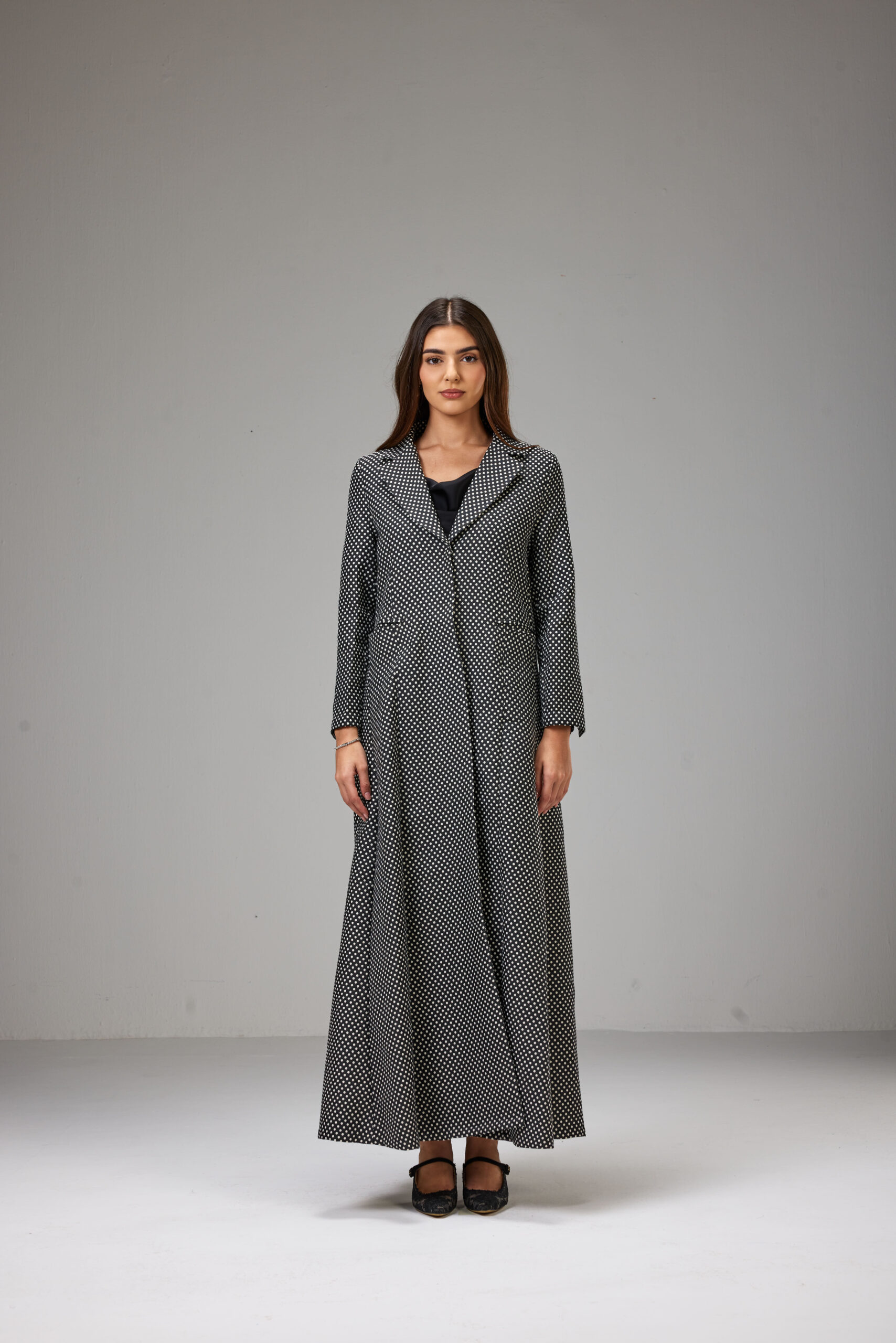 This is a classic double breasted jacket Abaya made of cotton jacquard fabric, soft surface on the inside.  Defined by its black base and minimal polka-dot print, It has a jacket cut with straight sleeves, two flap pockets.
