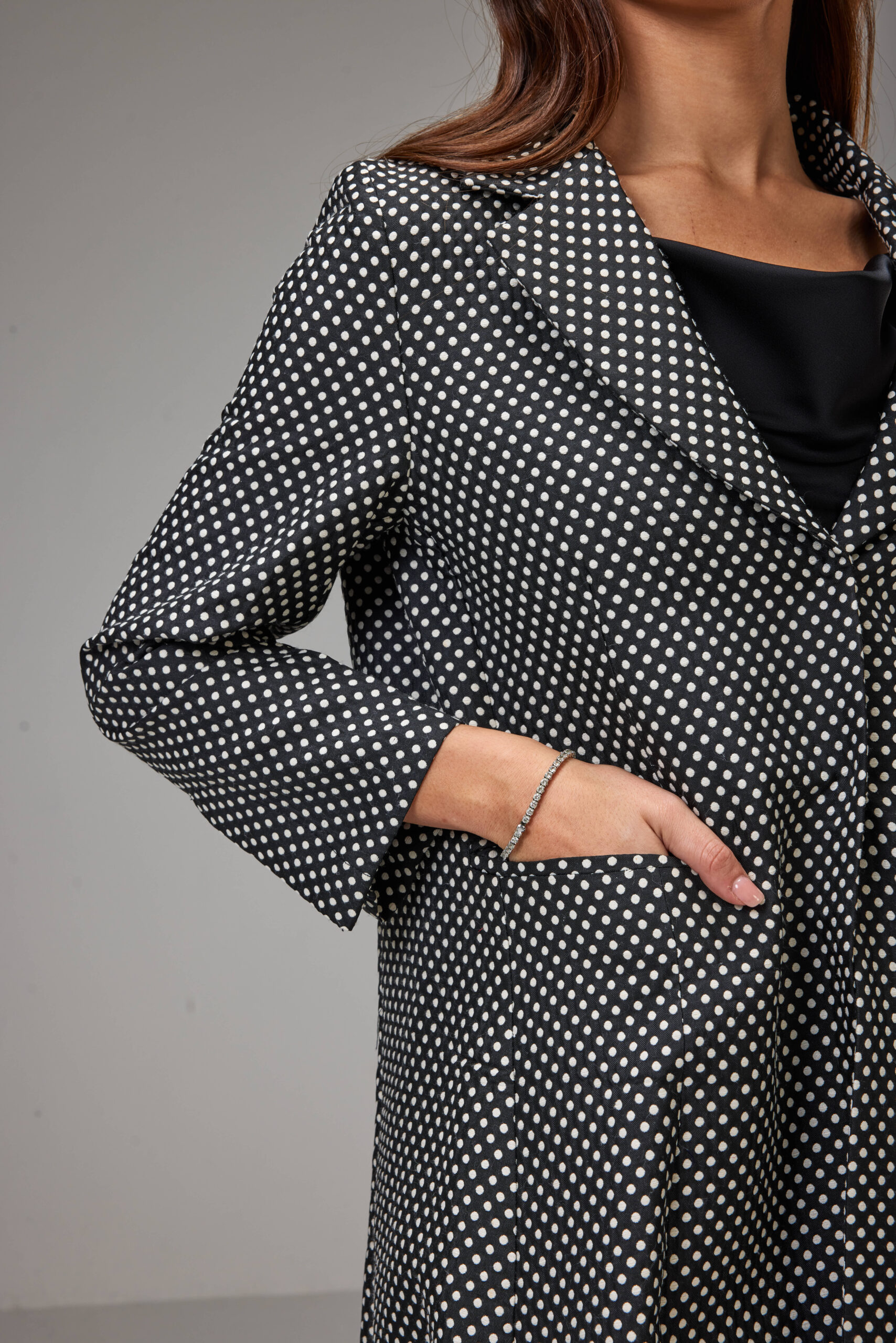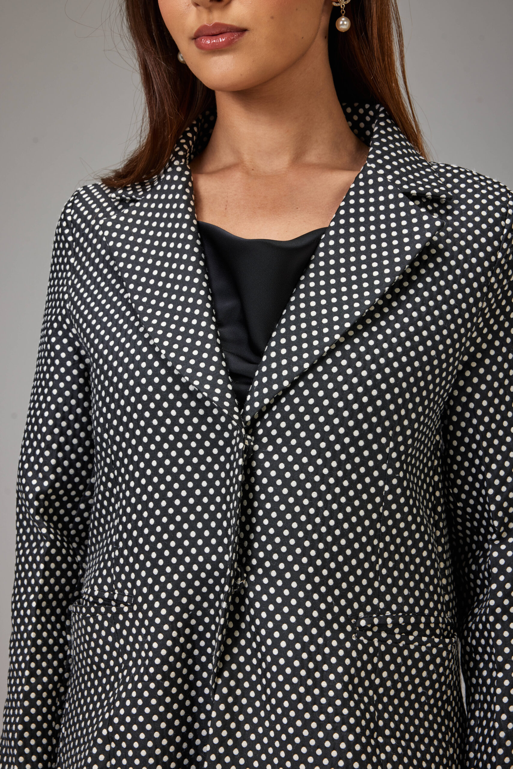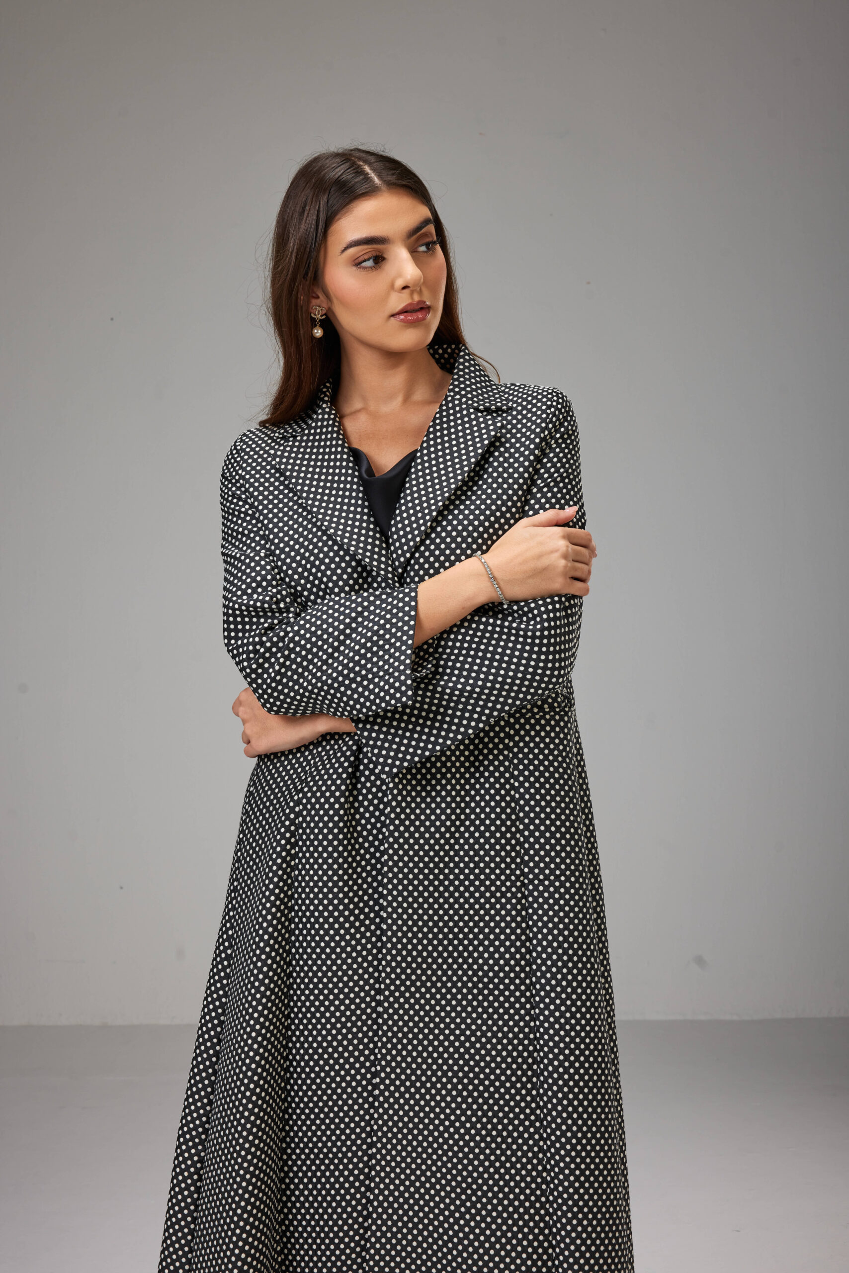 This is a classic double breasted jacket Abaya made of cotton jacquard fabric, soft surface on the inside.  Defined by its black base and minimal polka-dot print, It has a jacket cut with straight sleeves, two flap pockets.