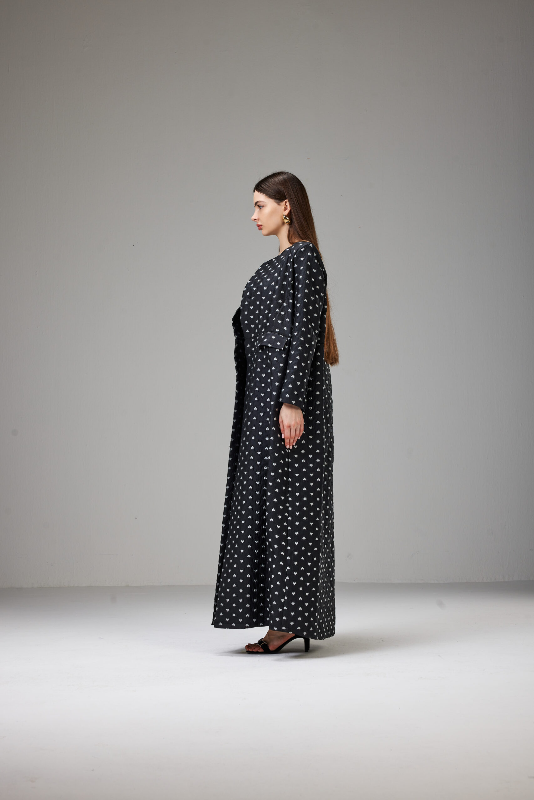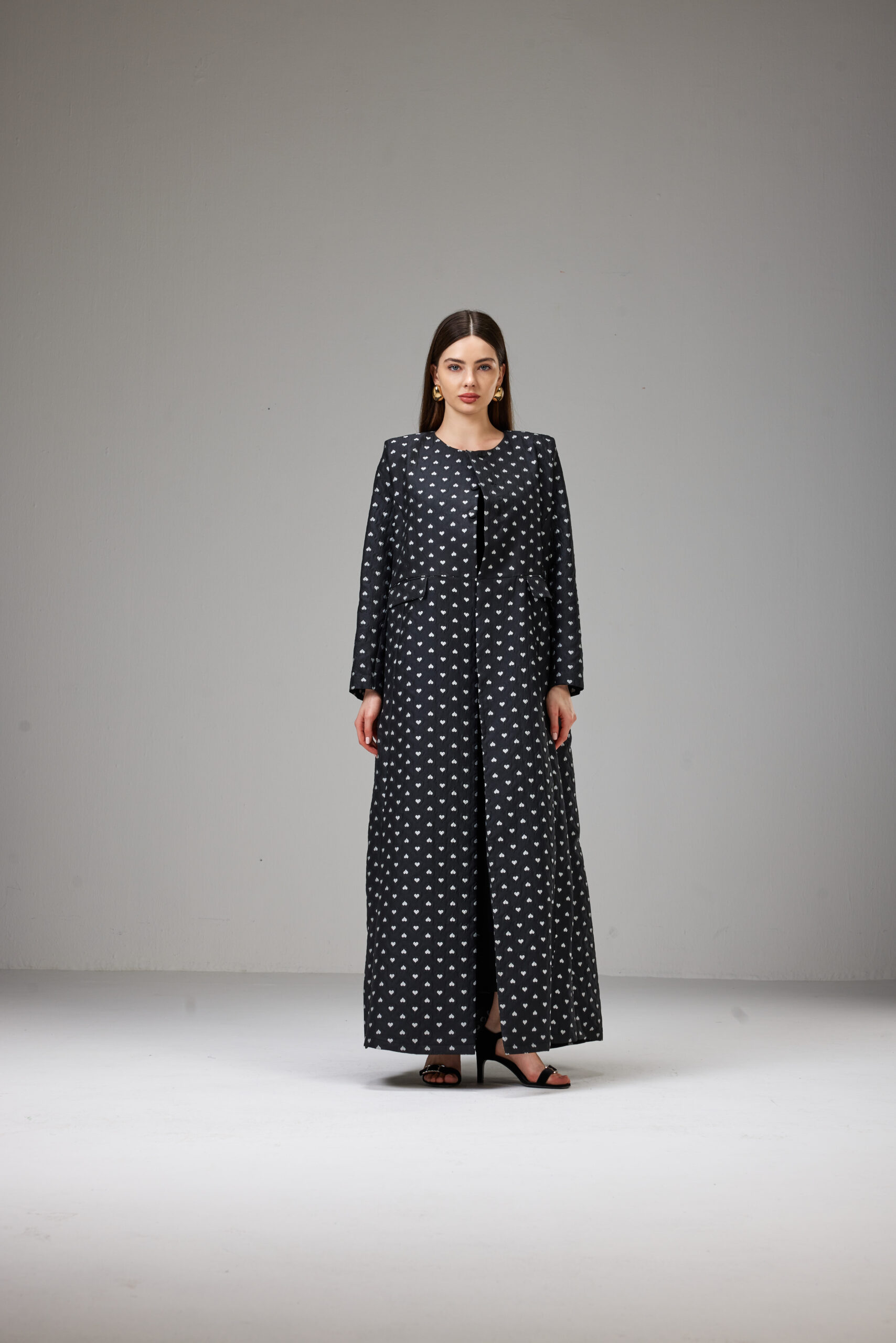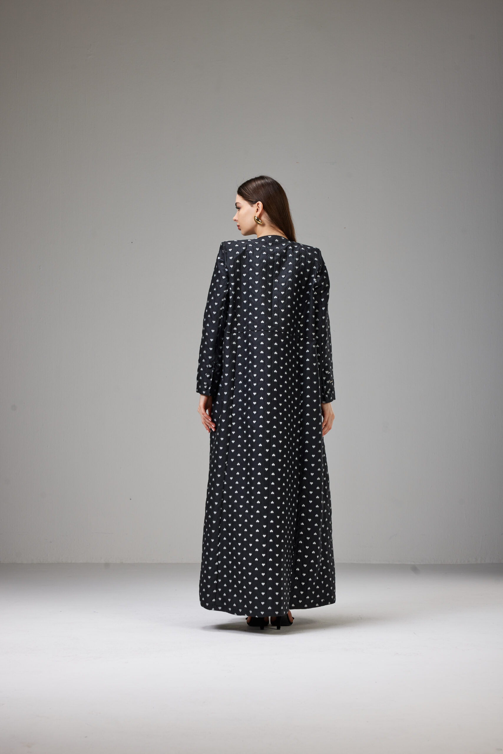 Jacket-cut abaya crafted from textured jacquard fabric with an elegant heart print, featuring a defined waist and full-length sleeves.