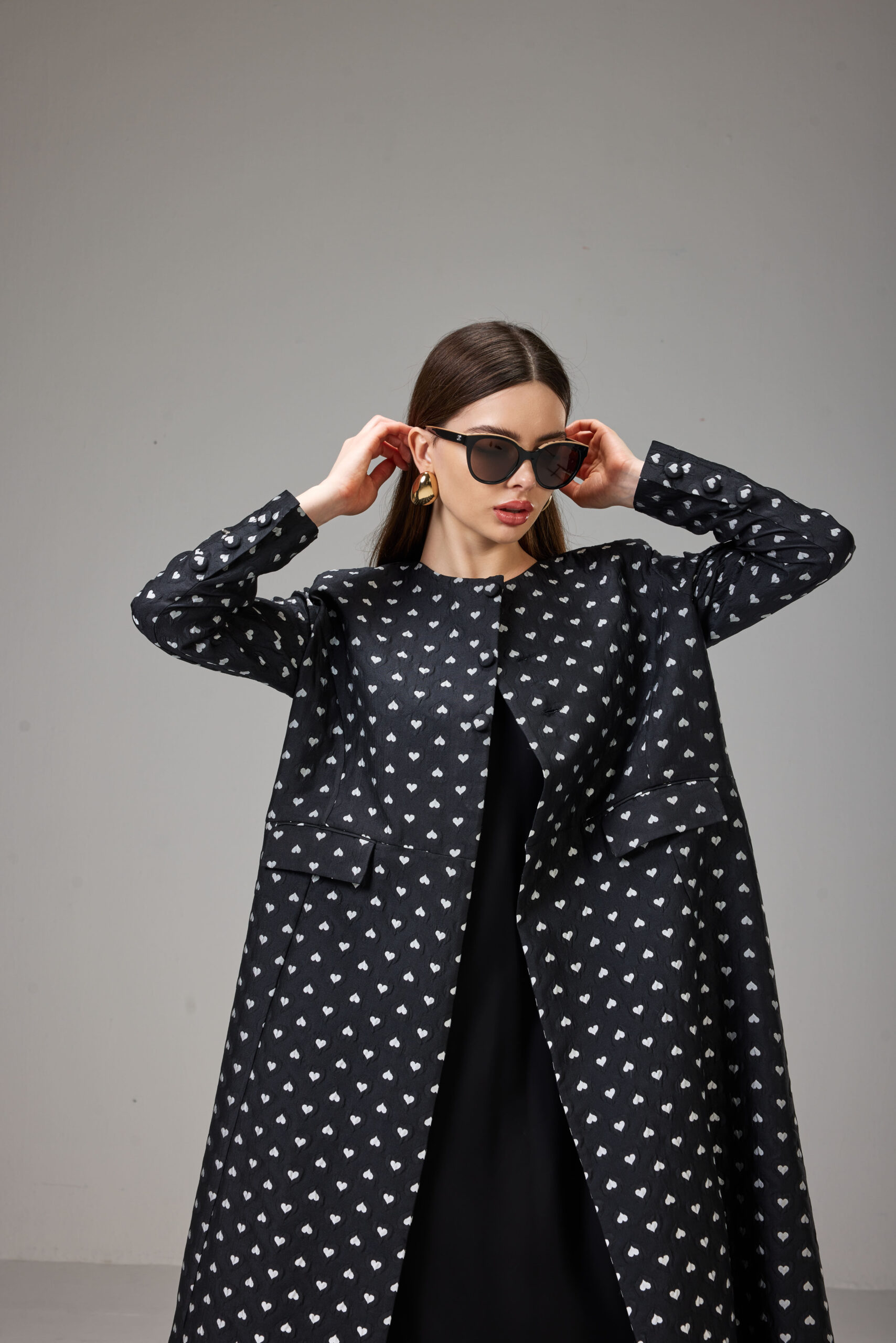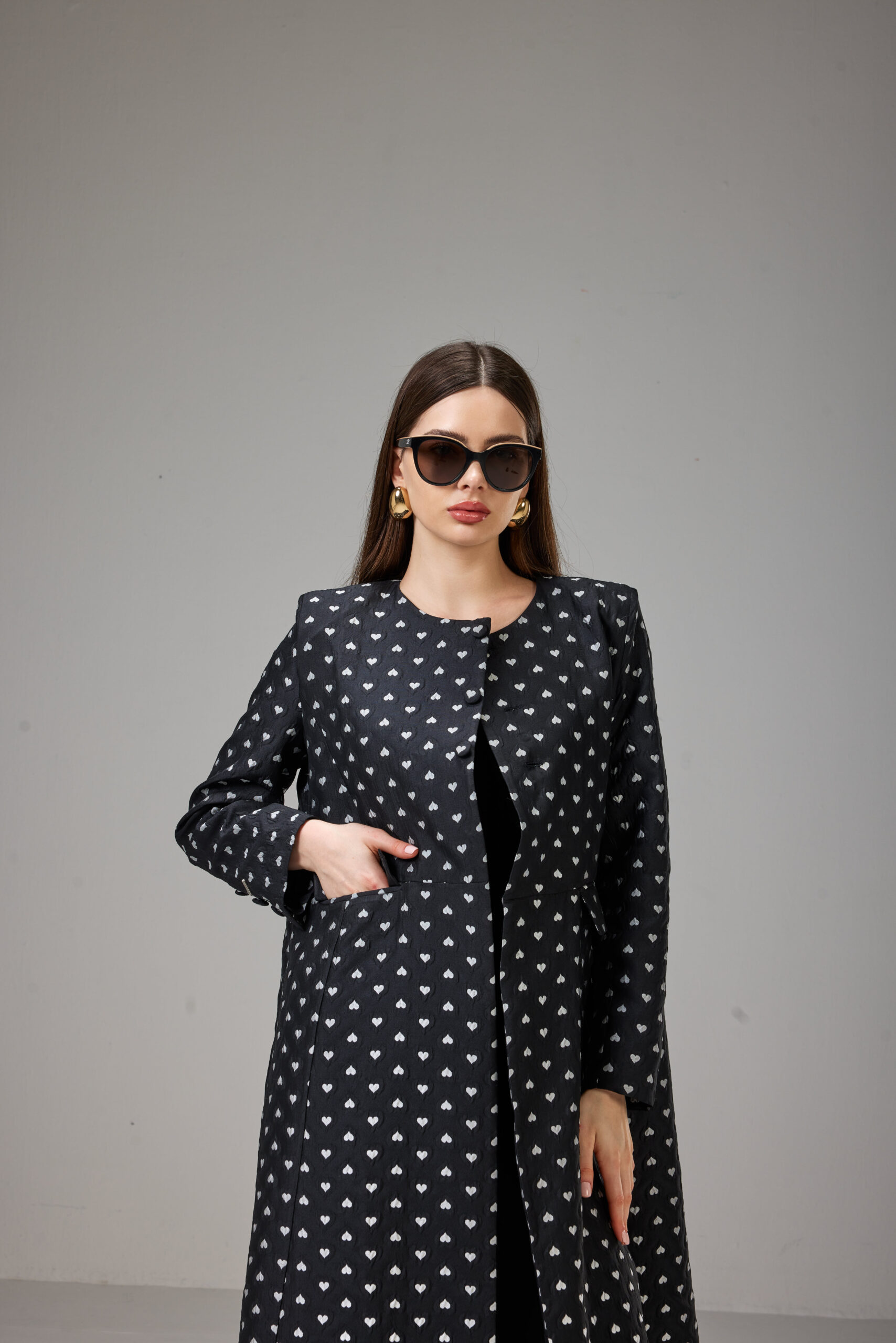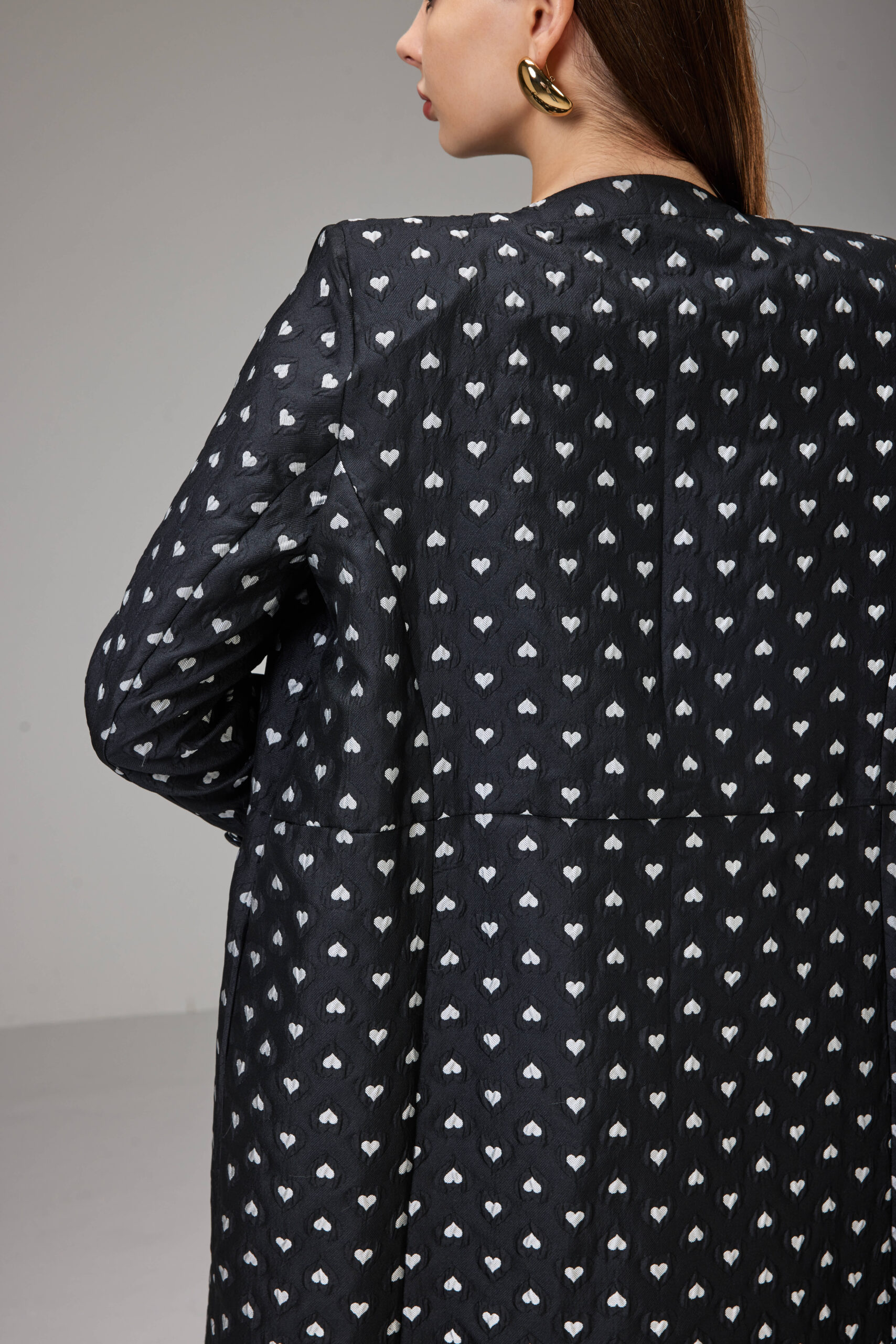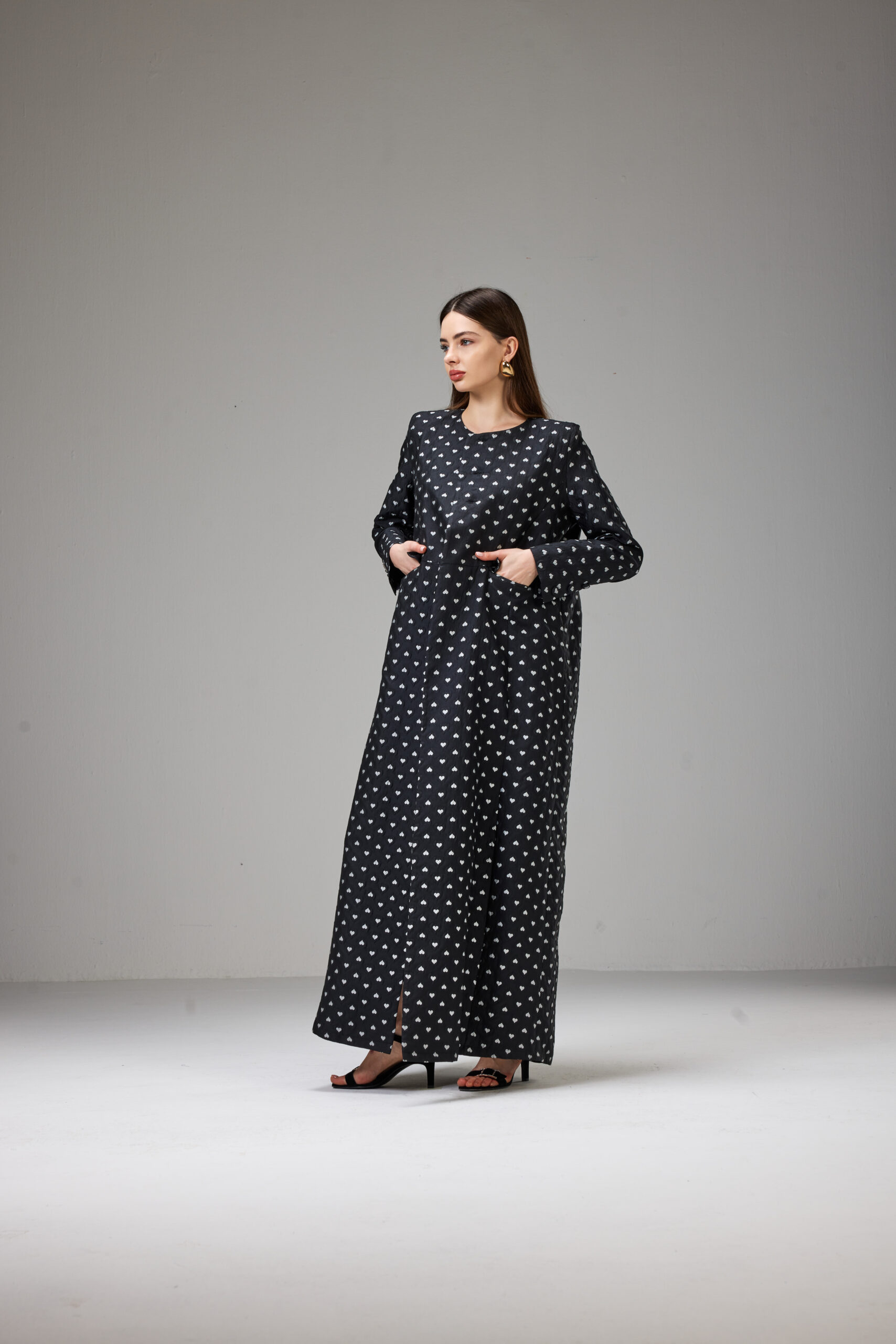Jacket-cut abaya crafted from textured jacquard fabric with an elegant heart print, featuring a defined waist and full-length sleeves.