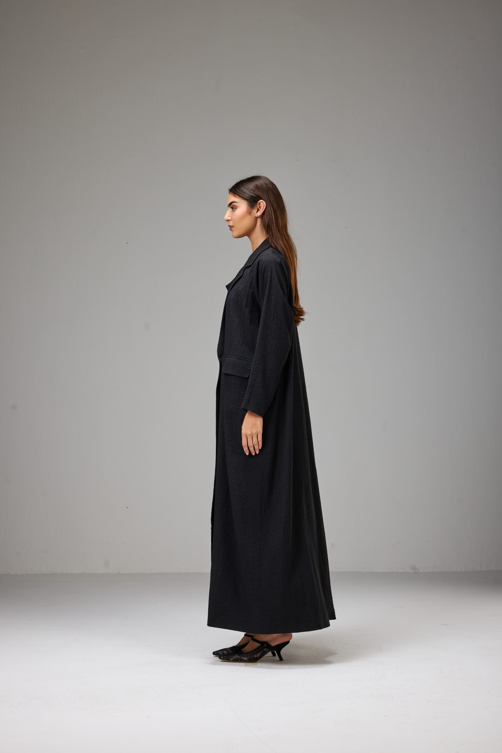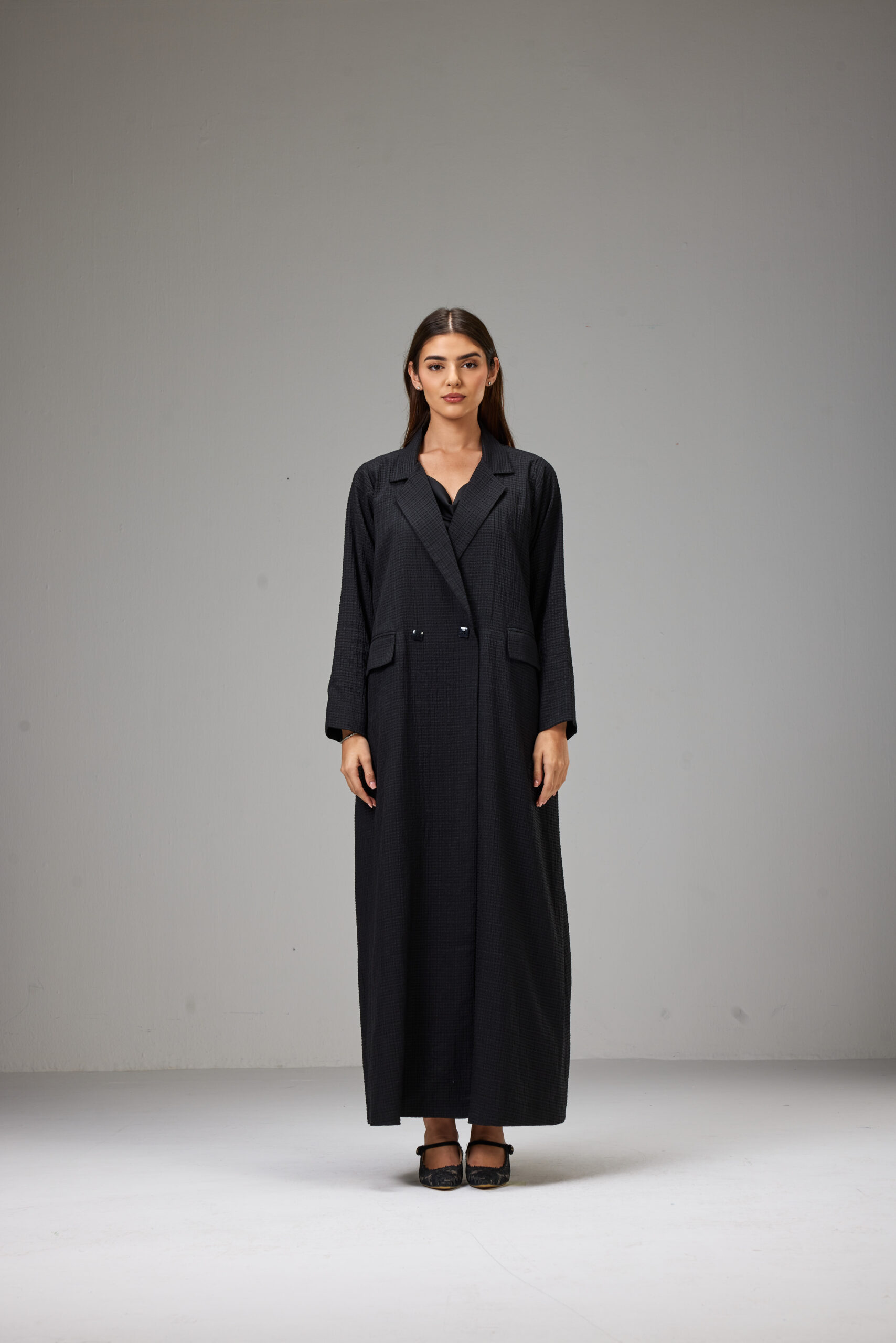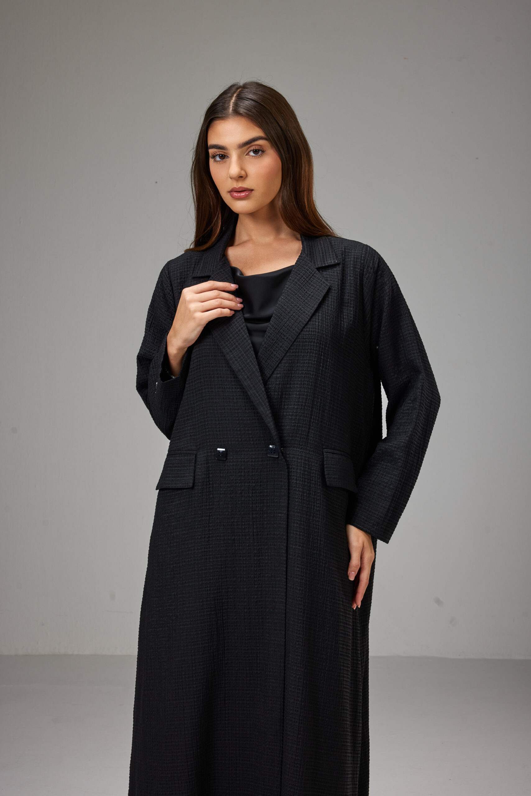 A straight-cut jacket abaya crafted from lightweight striped jacquard fabric, designed with a structured collar and side pockets.