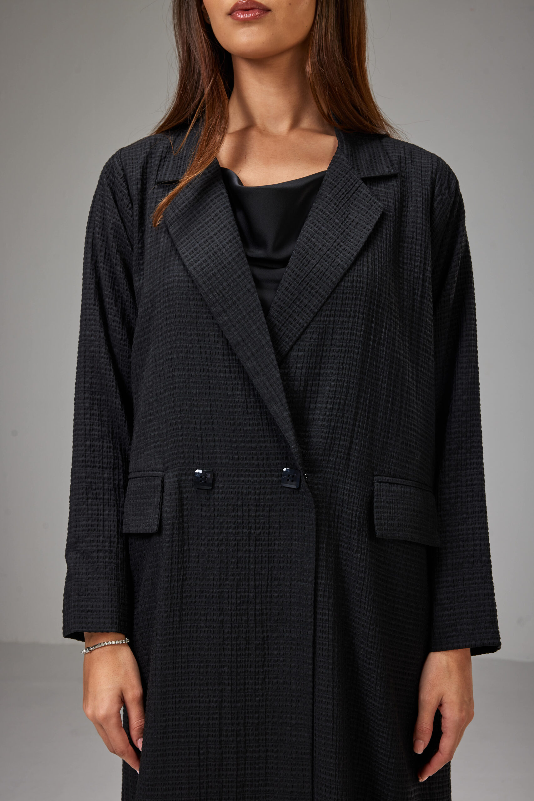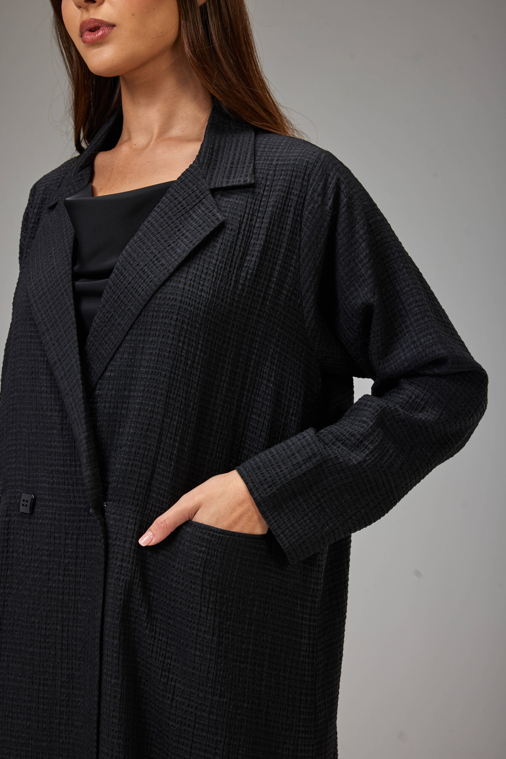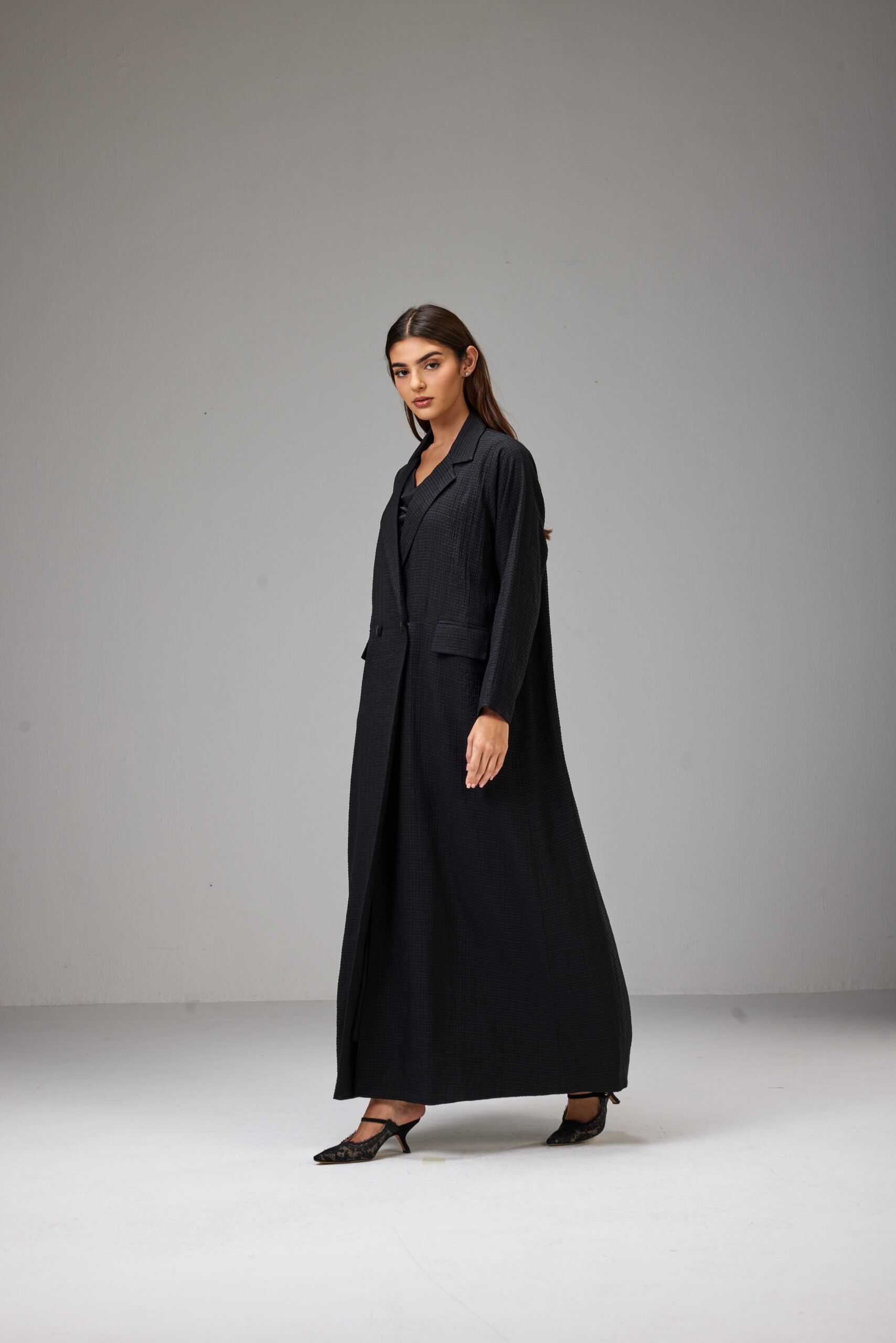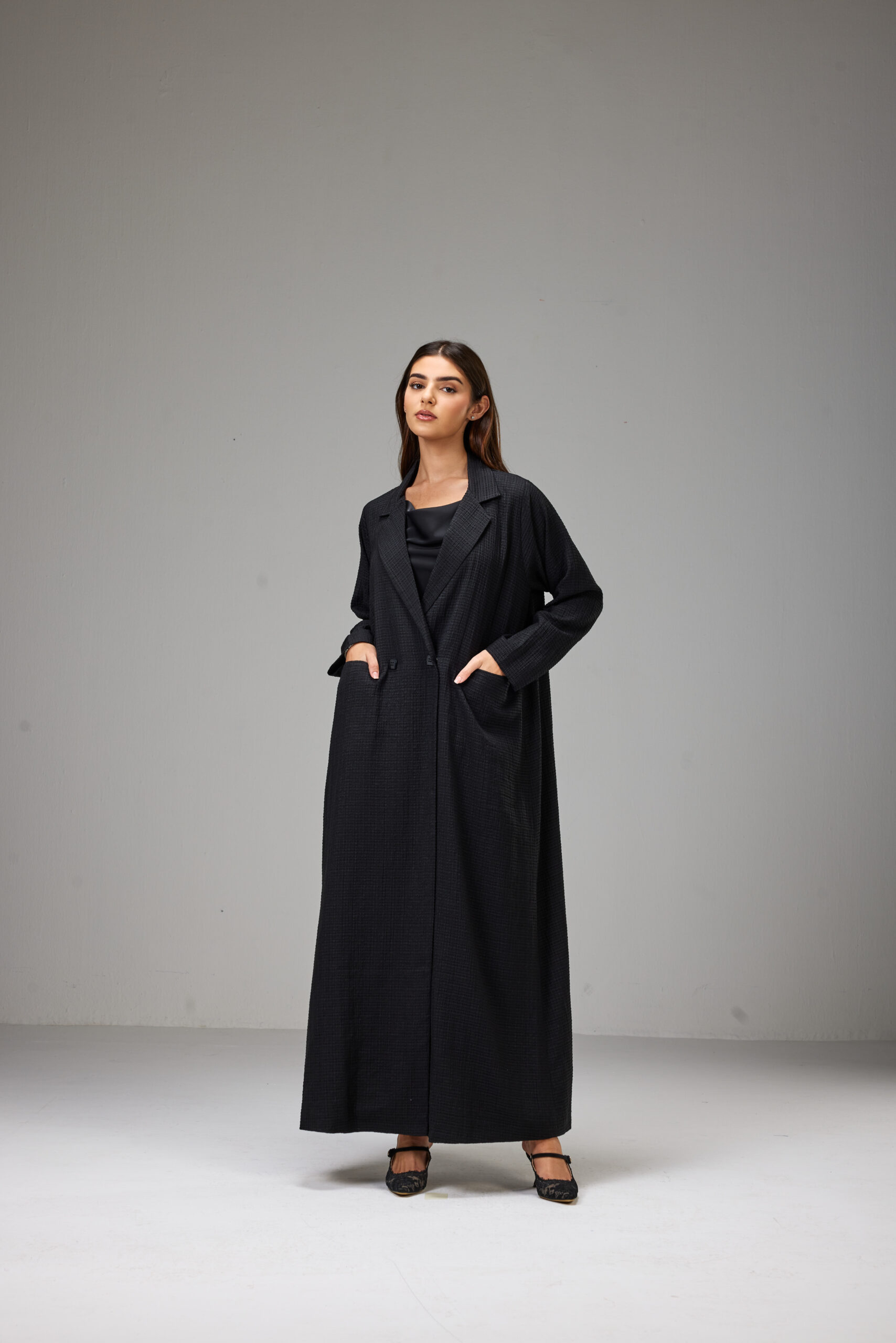 A straight-cut jacket abaya crafted from lightweight striped jacquard fabric, designed with a structured collar and side pockets.