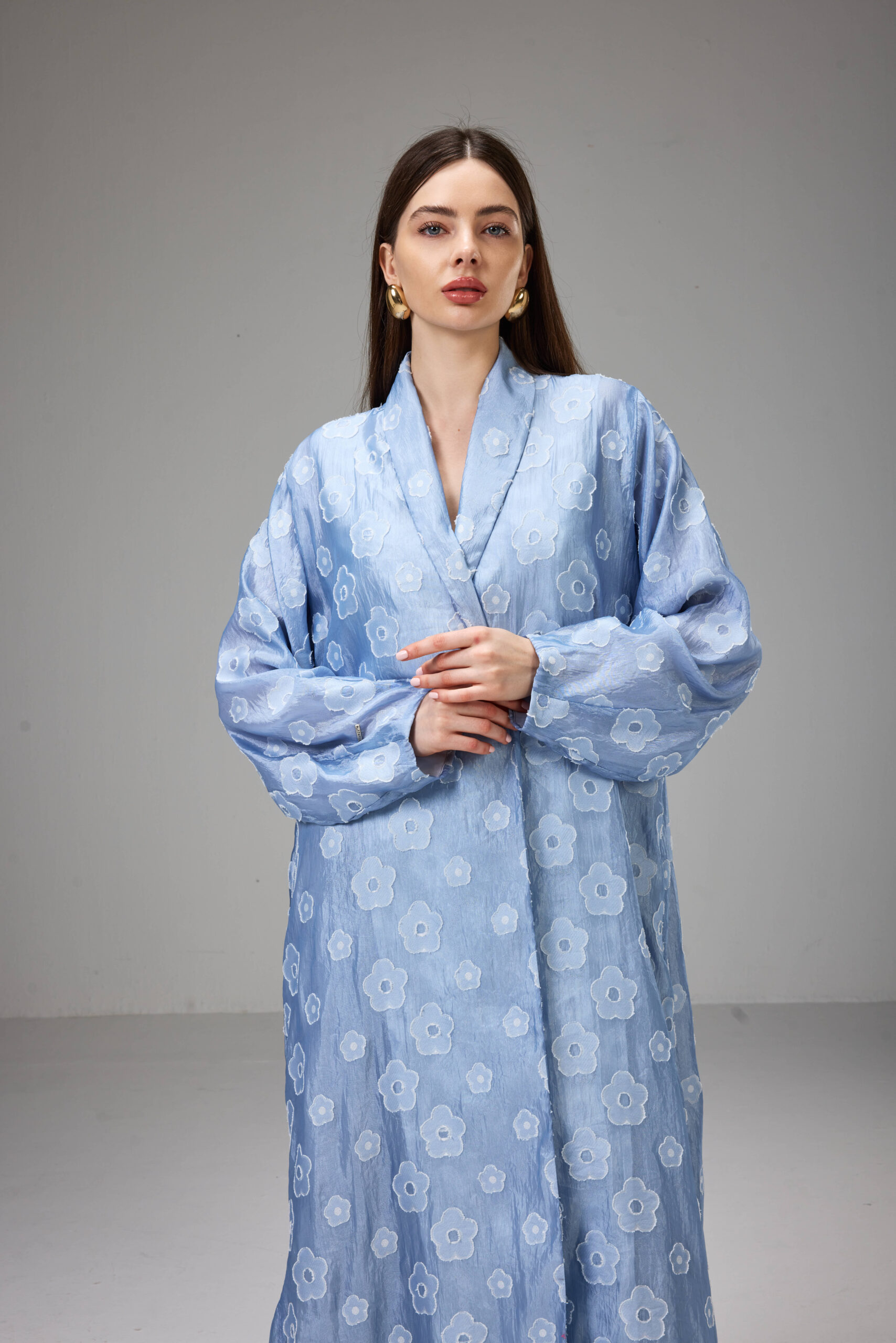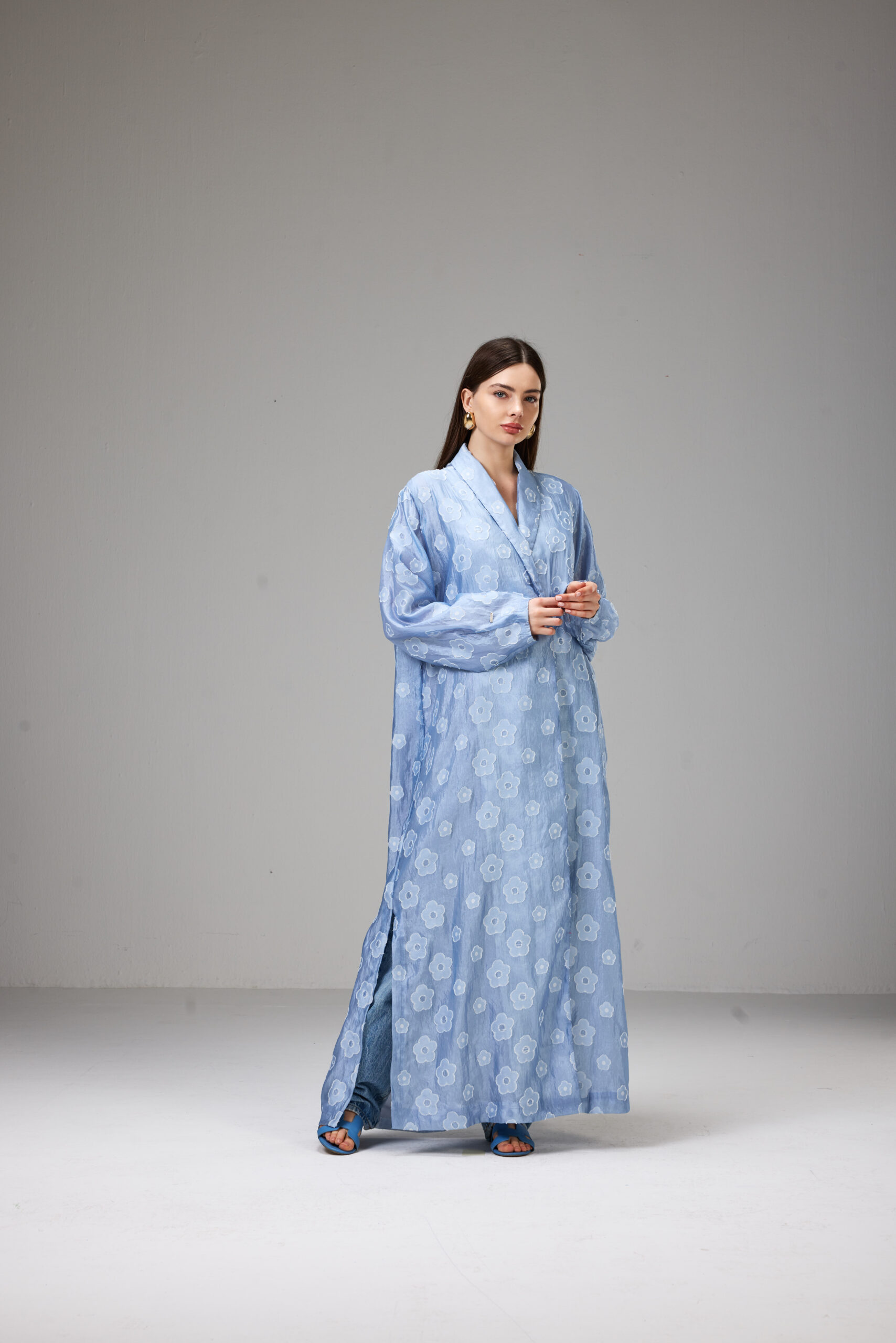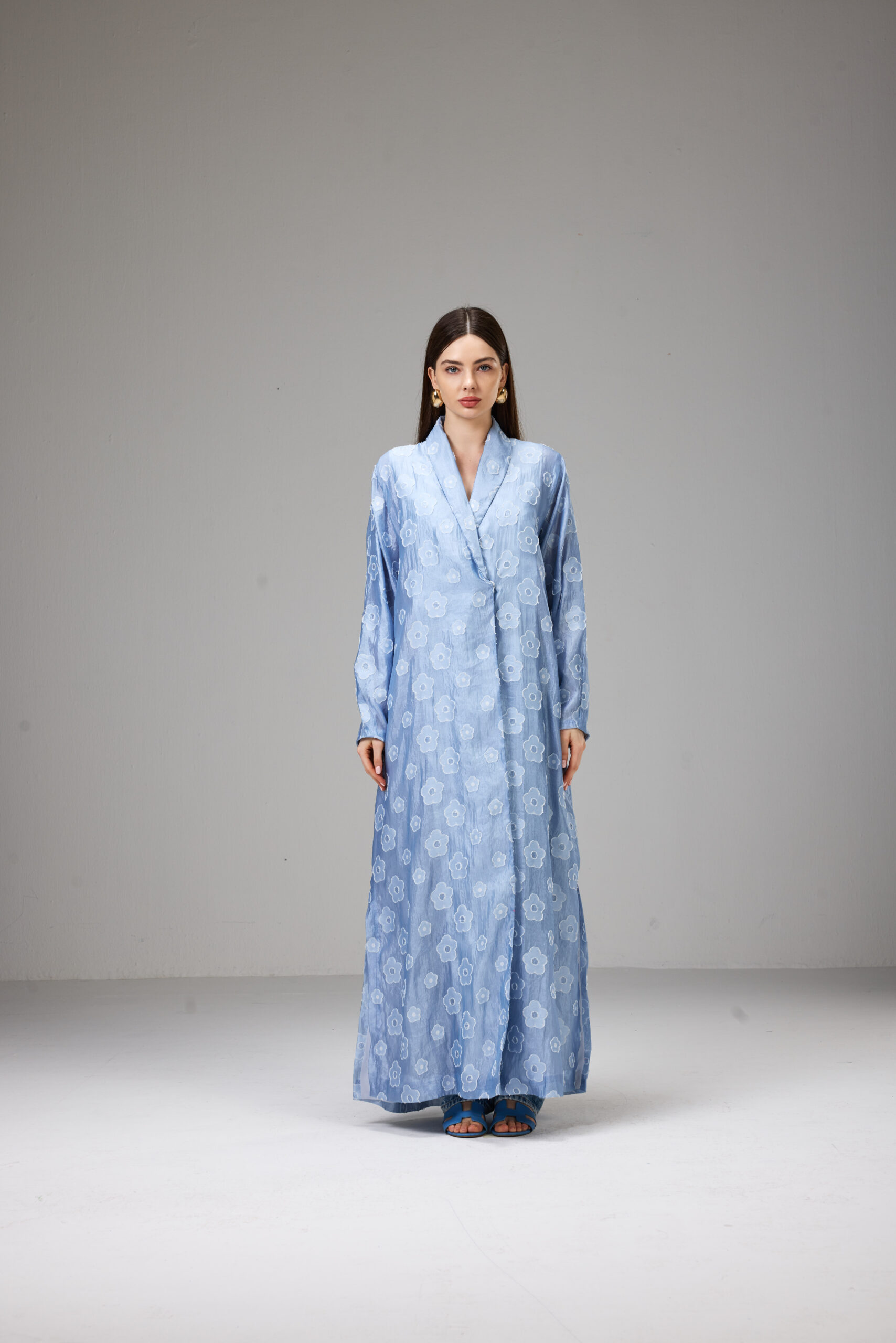 Straight-cut abaya crafted from lightweight jacquard in a soft sky-blue shade with delicate floral patterns.