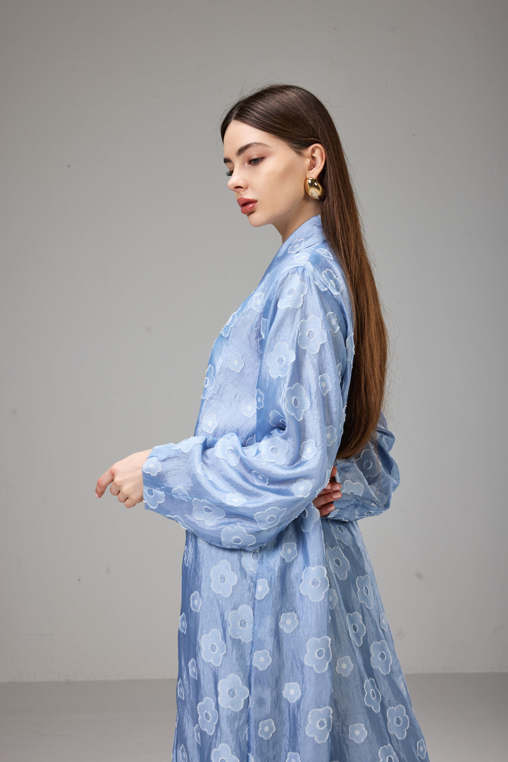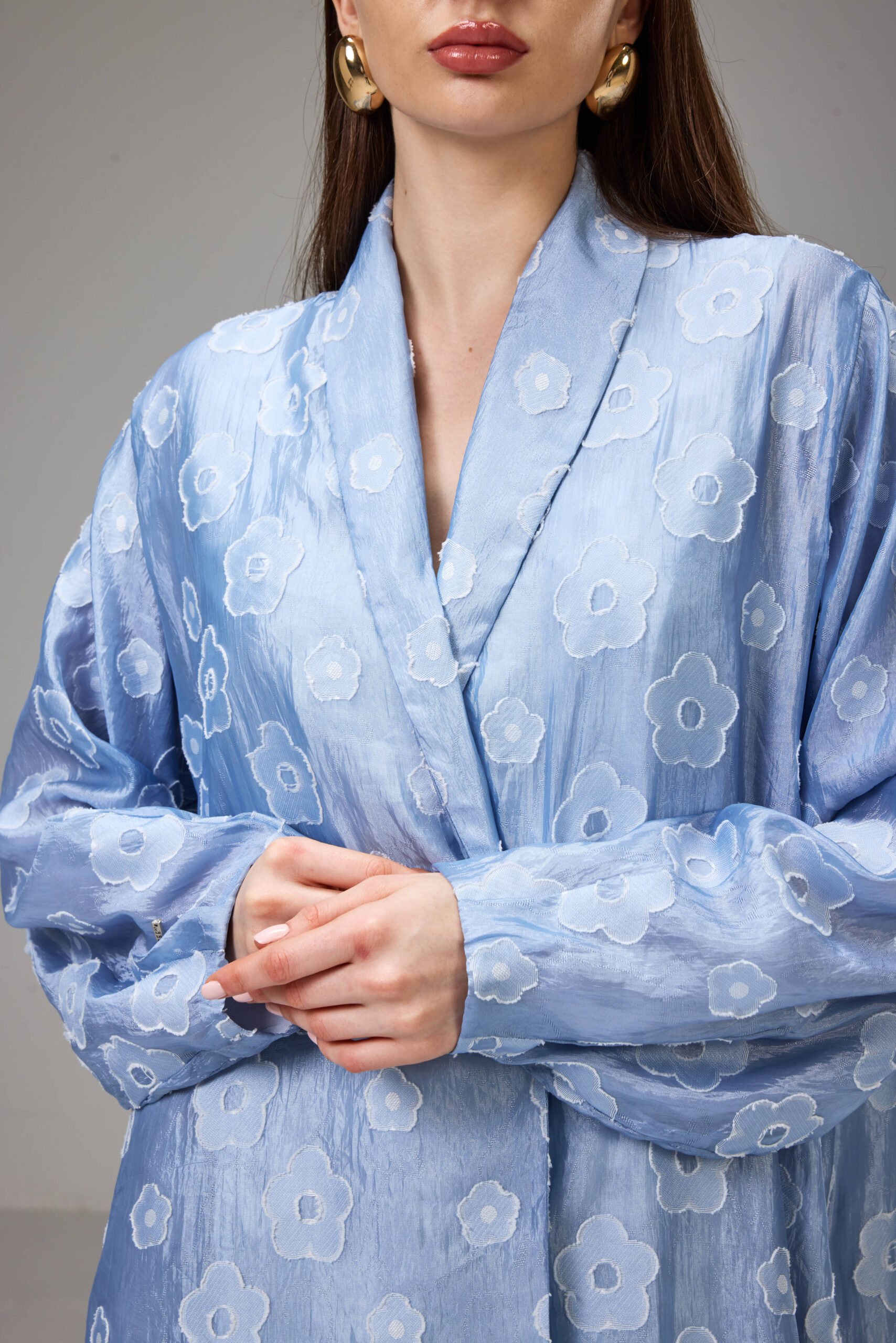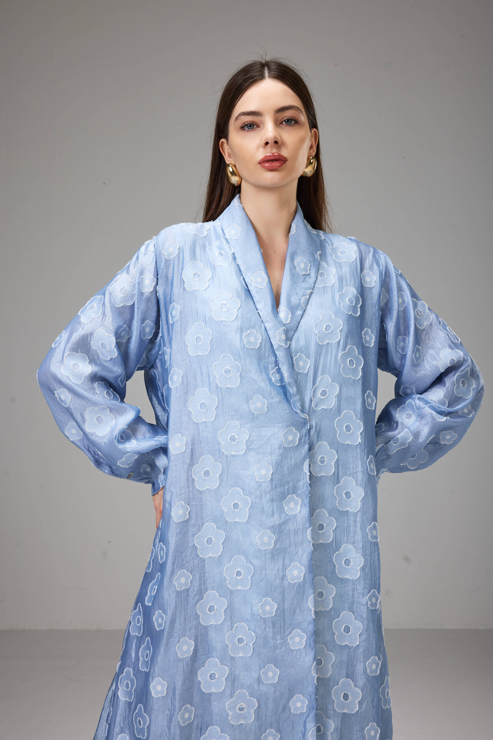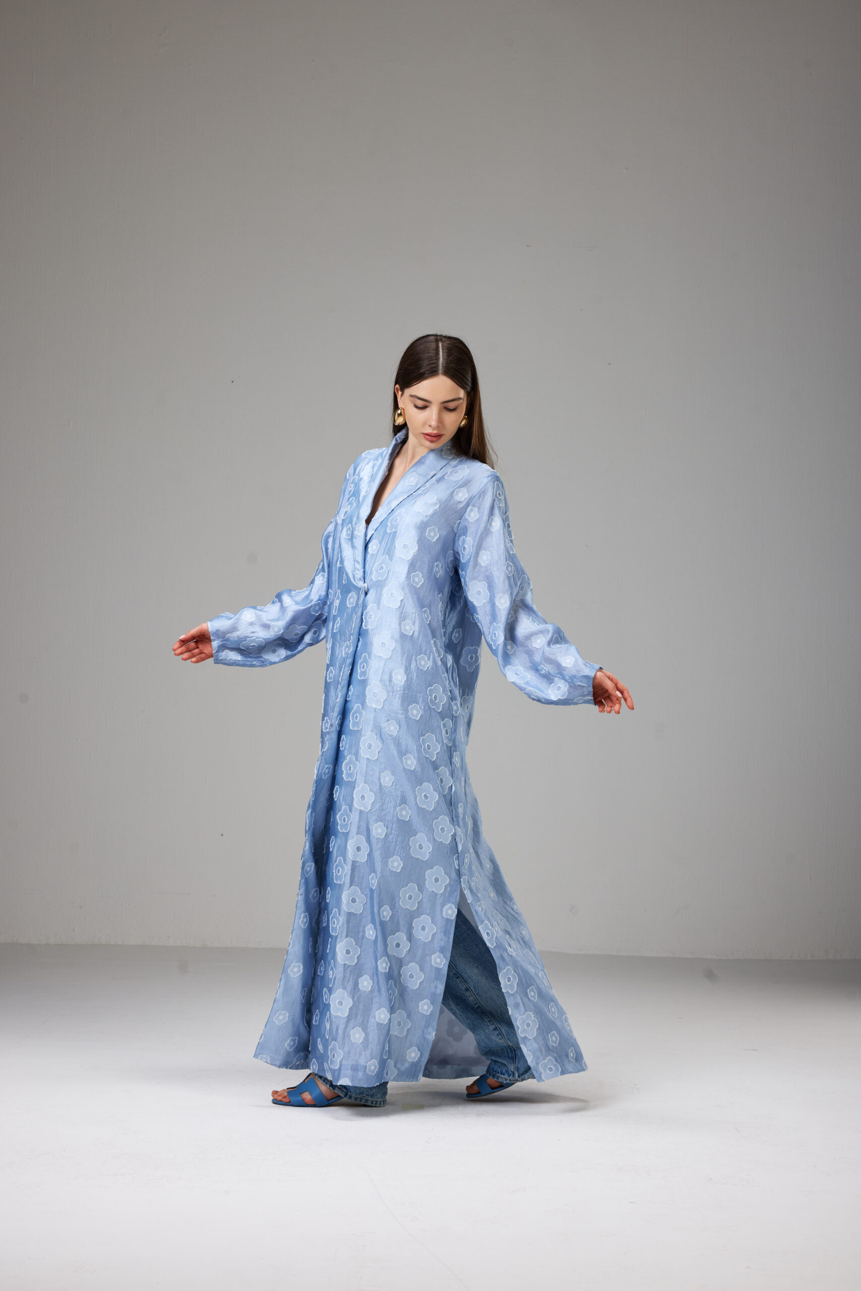 Straight-cut abaya crafted from lightweight jacquard in a soft sky-blue shade with delicate floral patterns.