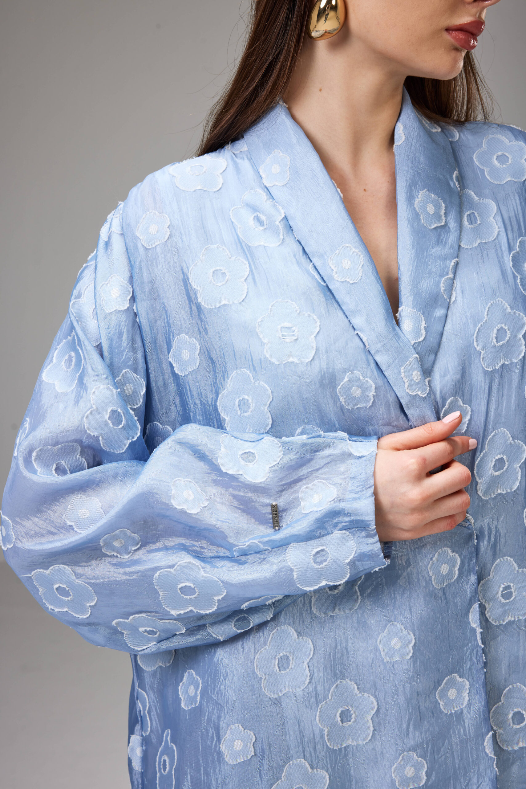 This enveloping straight-cut Abaya is crafted from pale blue jacquard Abaya weave of textured floral features, and refined embroidery details.
