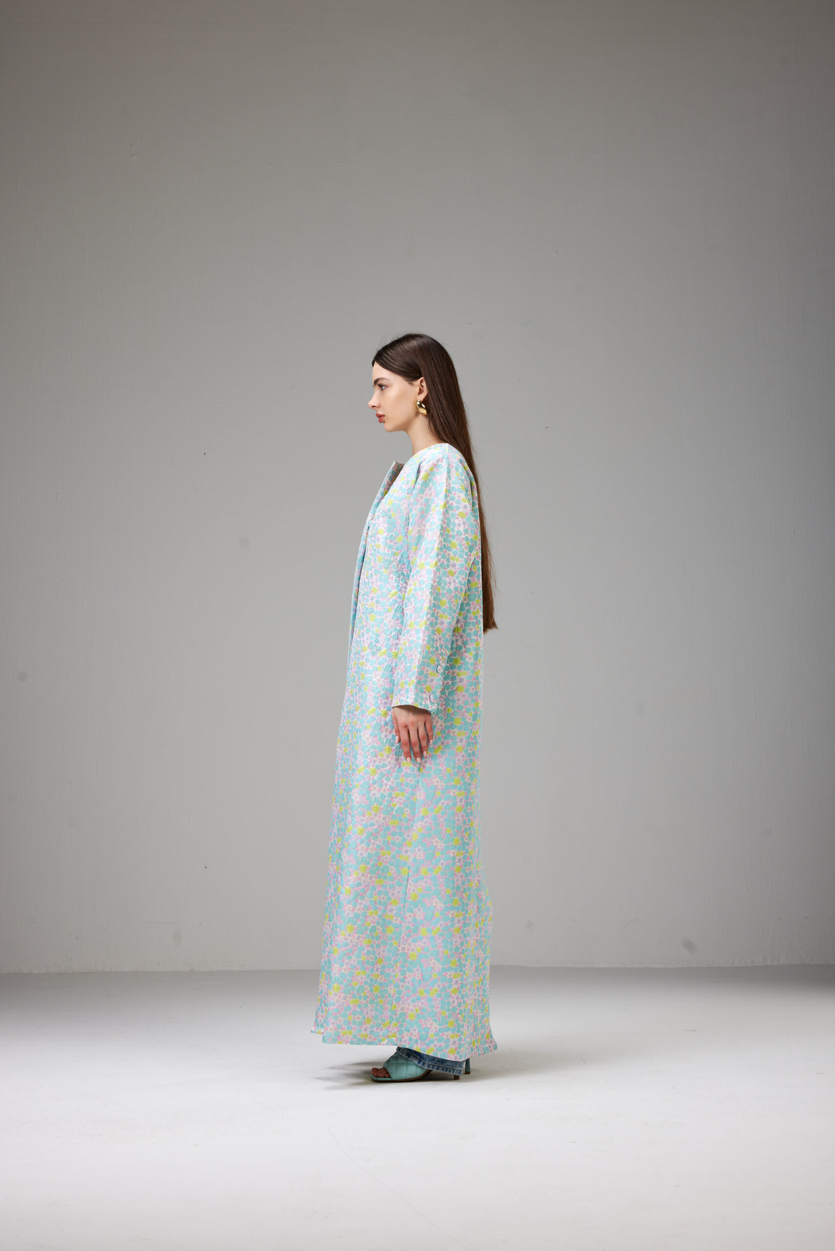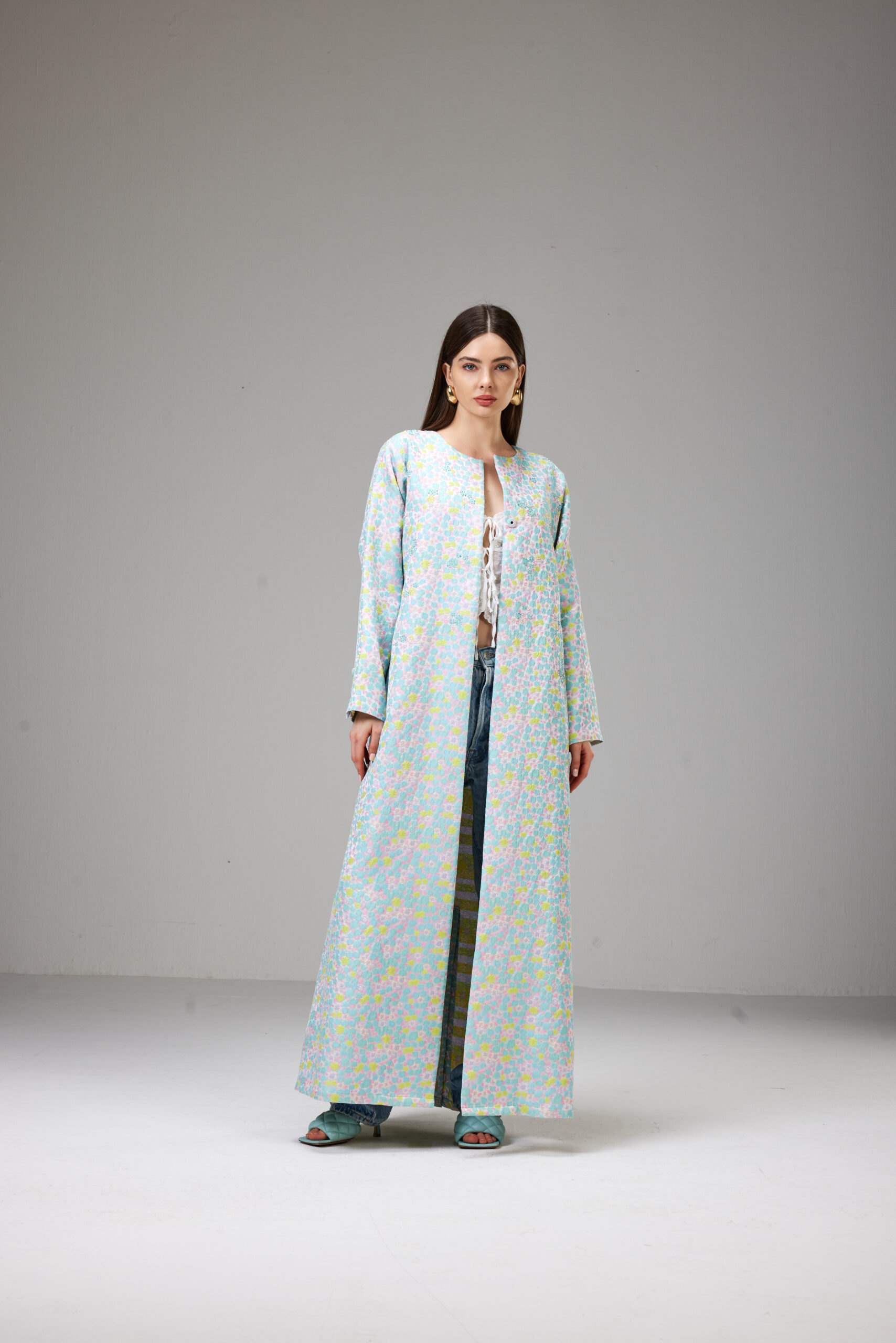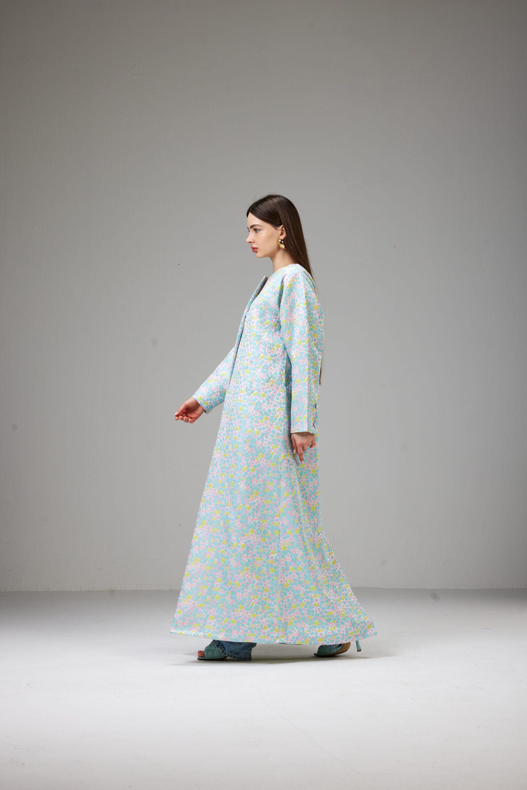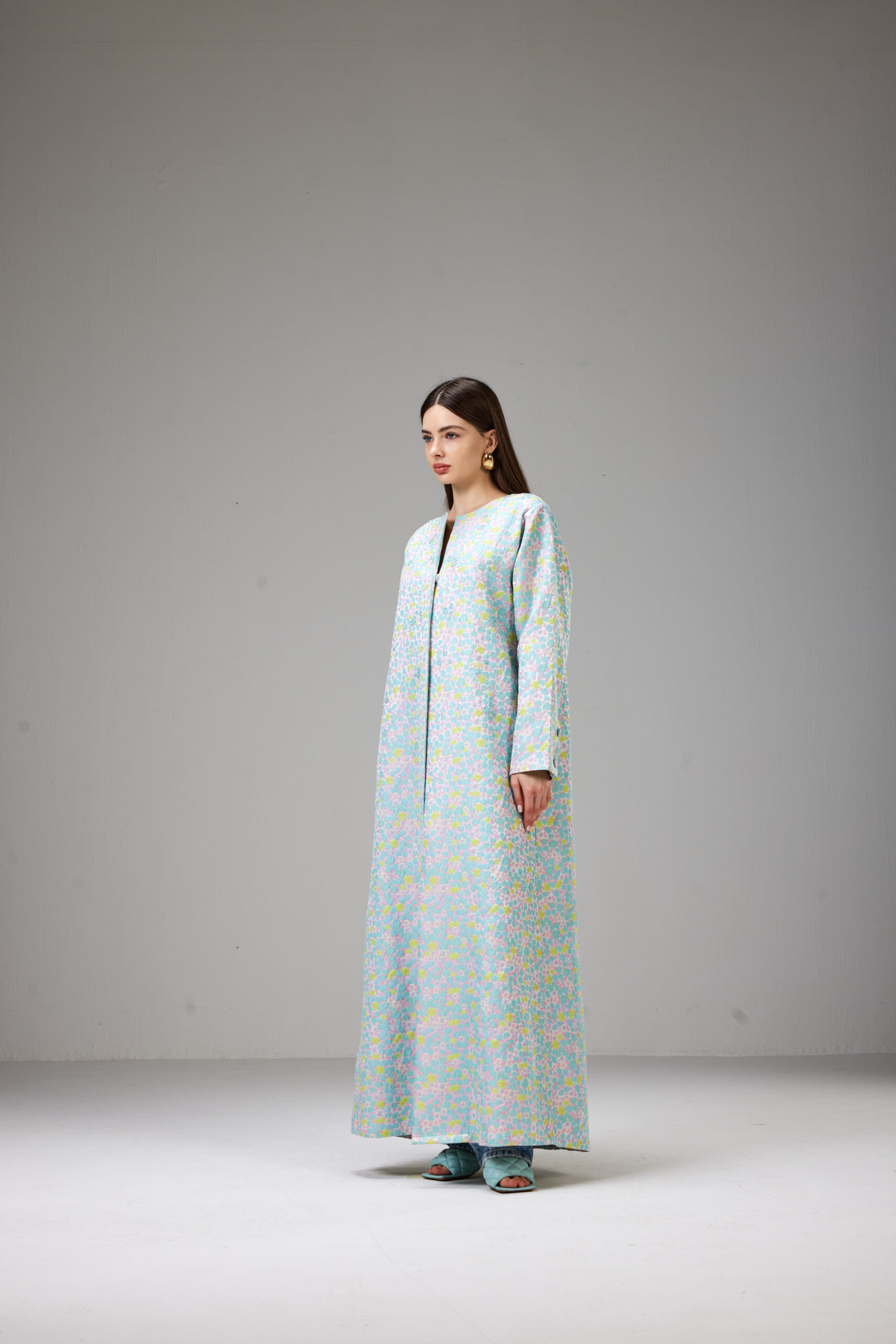 Straight-cut abaya crafted from lightweight jacquard in a soft sky-blue shade with delicate floral patterns.