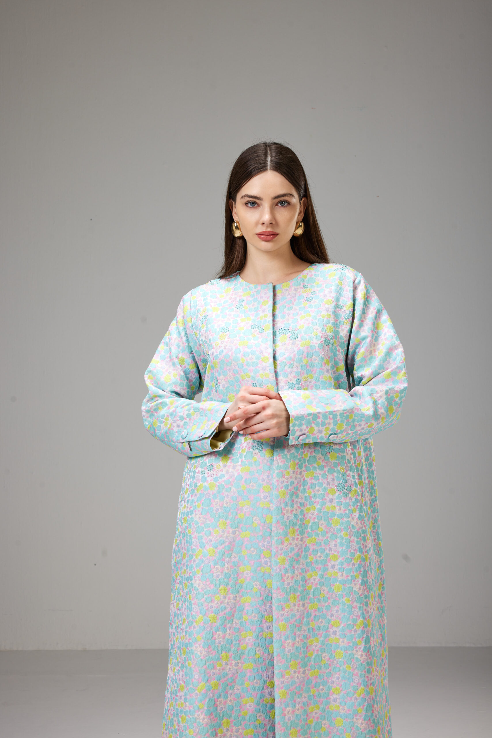 Straight-cut abaya crafted from textured jacquard fabric with delicate floral patterns and an elegant elongated neckline.