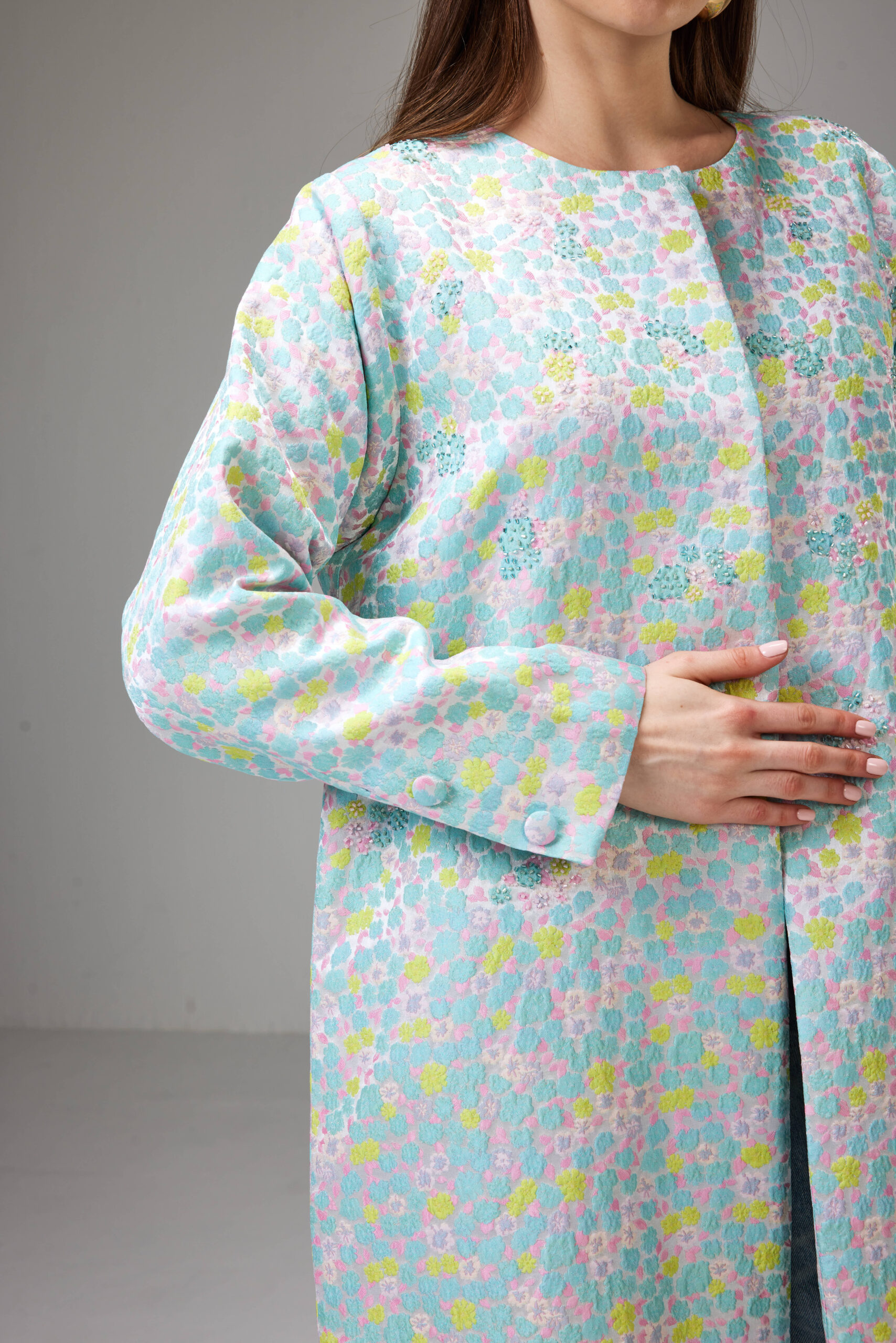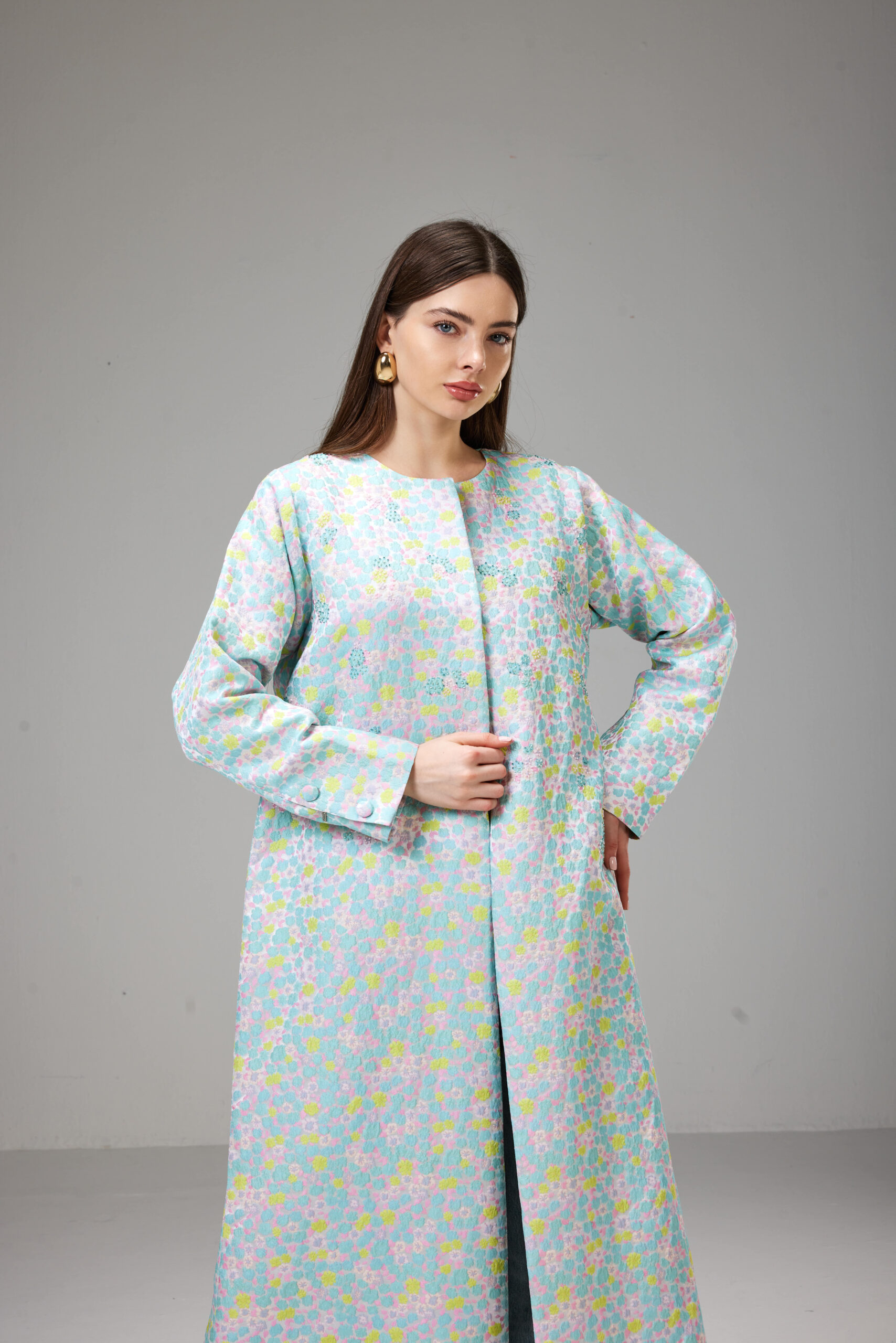 Jacket-cut abaya crafted from textured jacquard fabric in a soft pale green tone, adorned with delicate floral patterns.